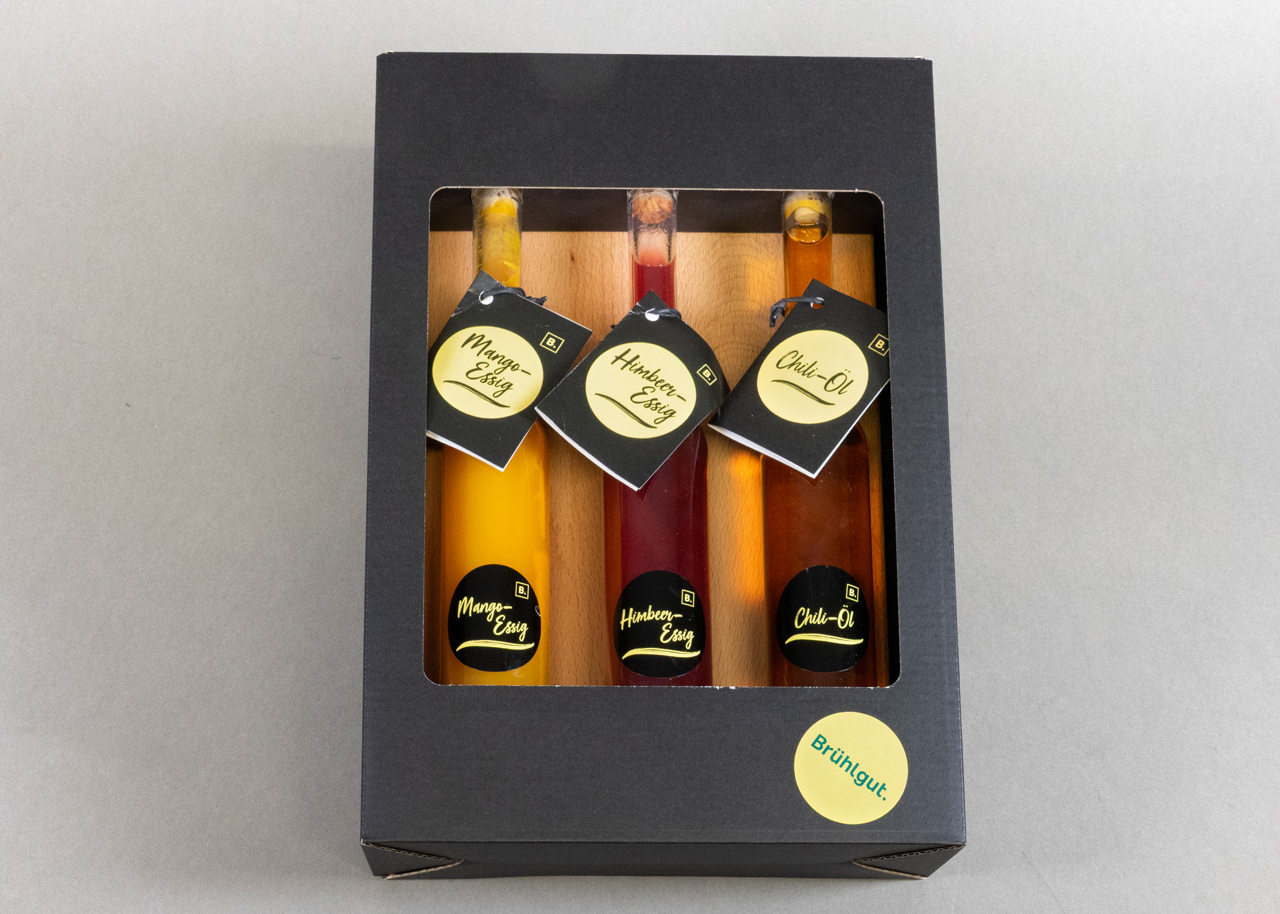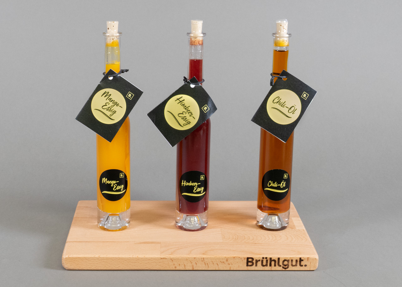 Aus unserer Küche von den Experten des Guten hergestellt. Inhalt: Mango-Essig (110 g), Himbeer-Essig (110 g) Chili-Öl (90 g), inkl. Schneidebrett Holz: Massivholz, keilverzinkt, Buche aus Europa, hergestellt in unserer Werkstatt Mass: ca. 30 cm x 20 cm Haltbarkeit: ab Herstellung 6 Monate