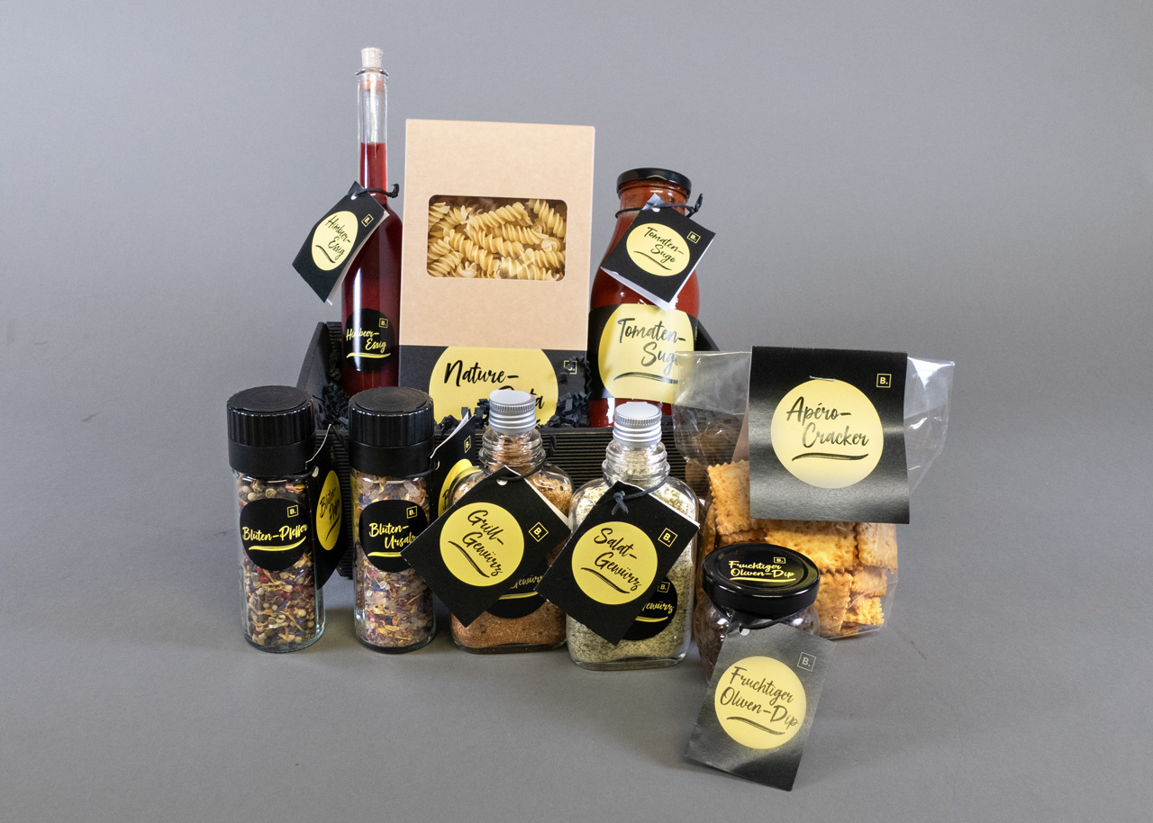 Inhalt: Spiralen nature (400 g), Salatgewürz (70 g), Grillgewürz (90 g), Blüten-Pfeffer (40 g), Oliven-Dip (90 g), URDinkel Apéro-Cracker (150 g), Blüten-Ursalz (70 g), Tomatensugo (500 g), Himbeer-Essig (110 g)
