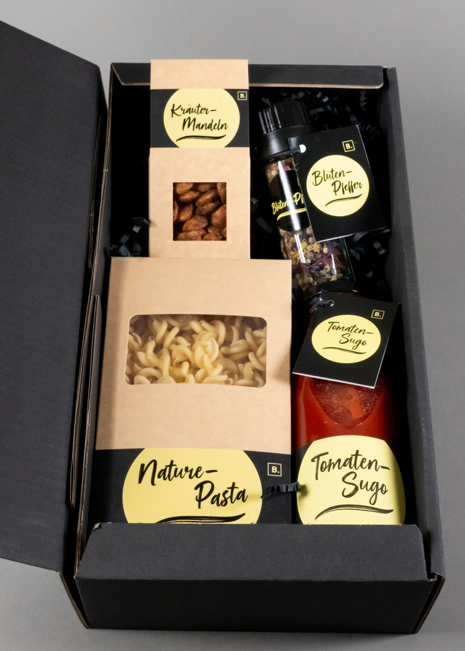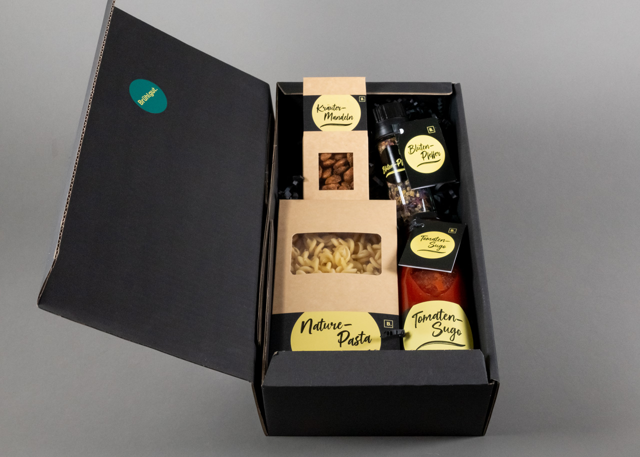 Inhalt: Gletscherhüetli (400 g), Tomatensugo (500 g) Blüten-Pfeffer (40 g), Kräutermandeln (90 g)