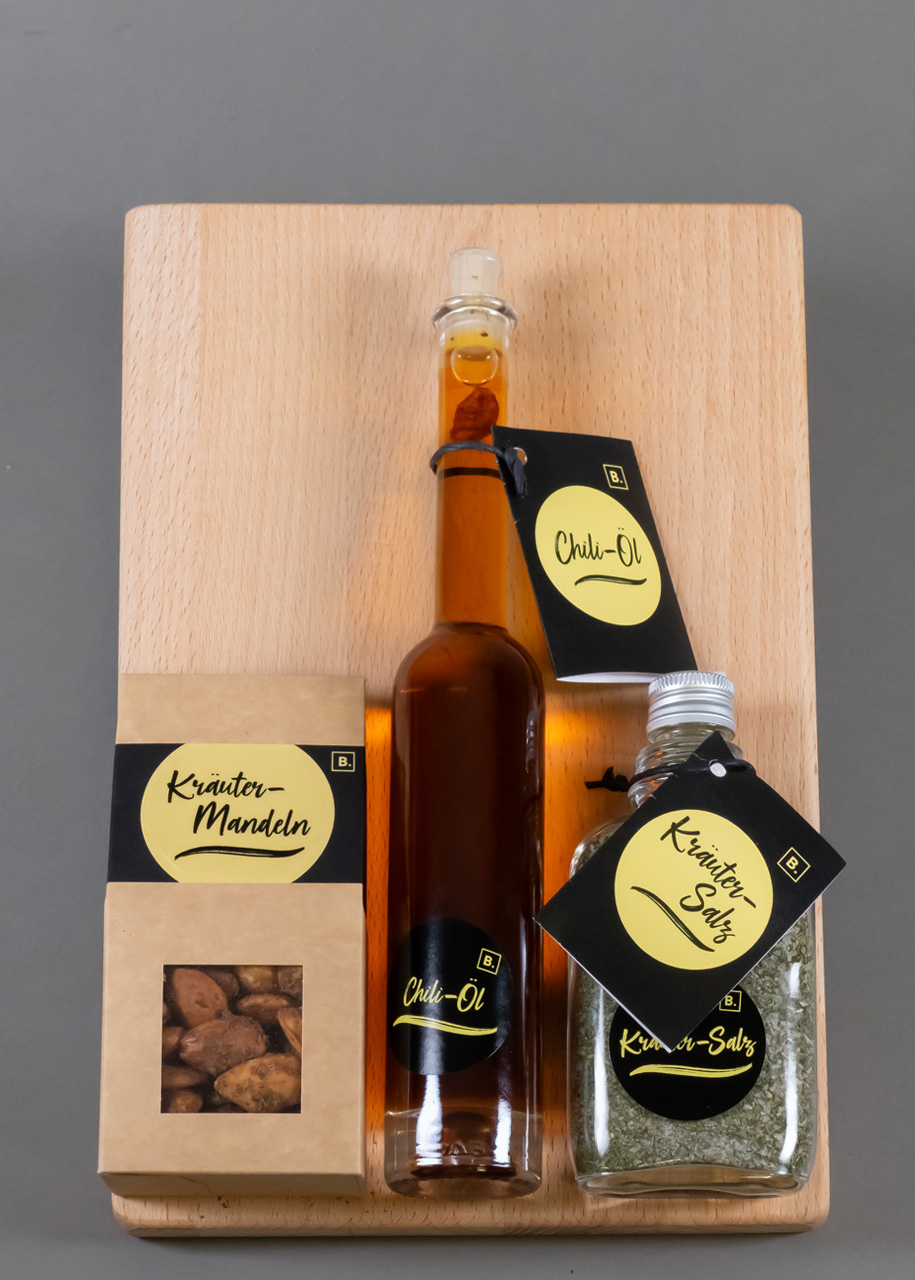 Inhalt: Chili-Öl (90 g), Kräutermandeln (90g), Kräutersalz (90g), Schneidebrett (20 x 30 x 2 cm)