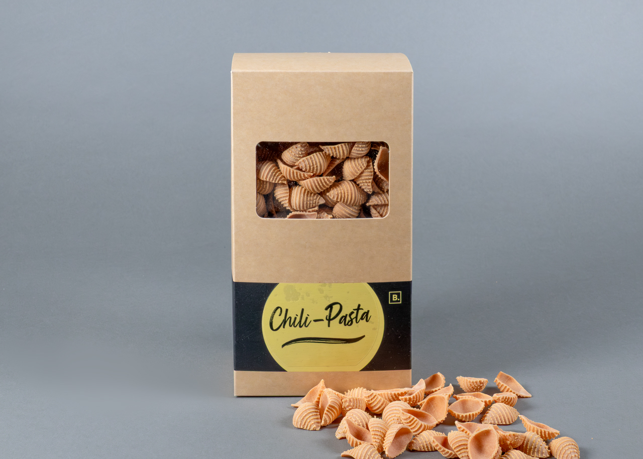 Diese schärfere Variante in Muschelform bringt Abwechslung auf Tisch und Teller und ist Augenschmaus zugleich. Pasta aus Hartweizengriess mit Vollei hergestellt.