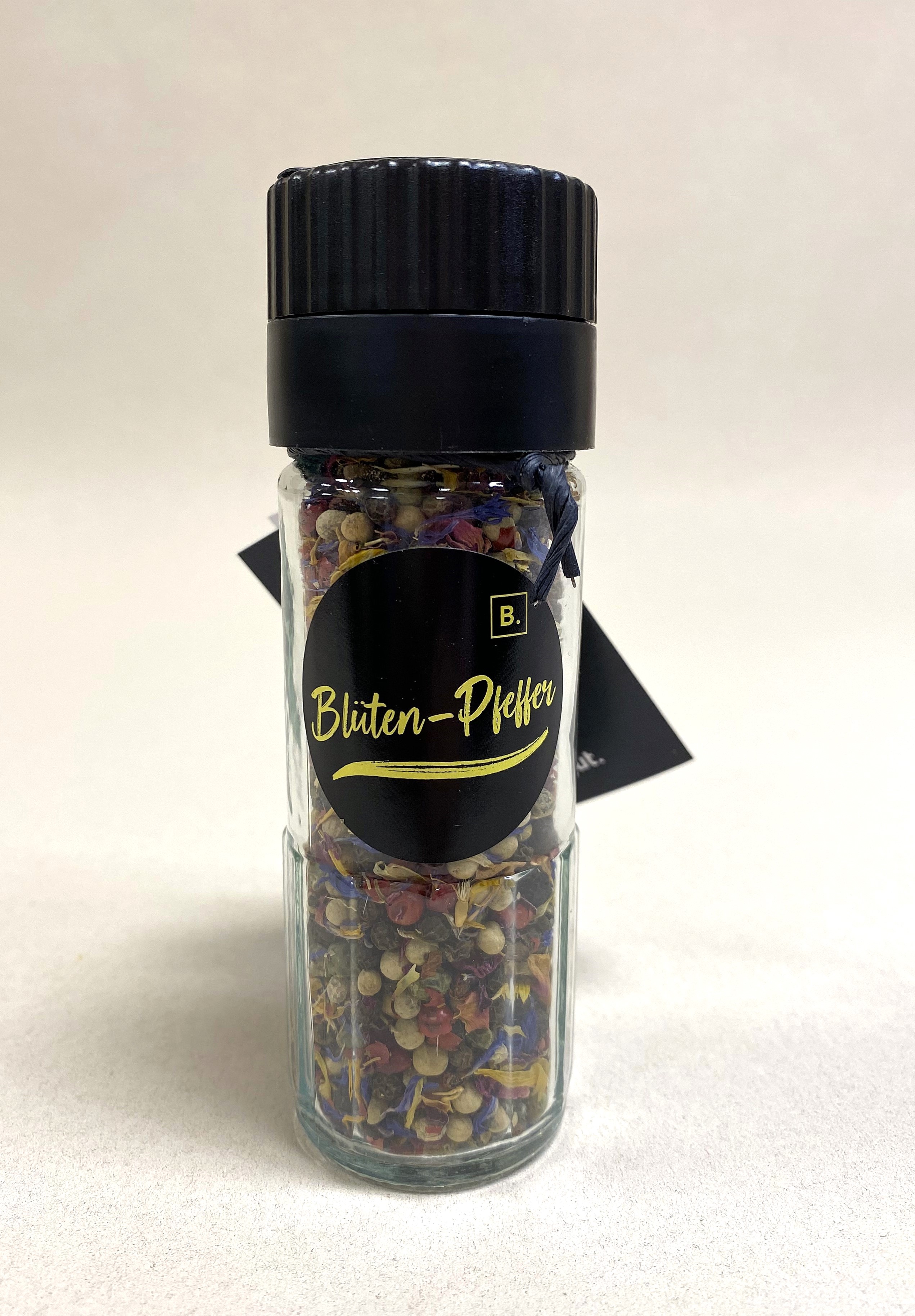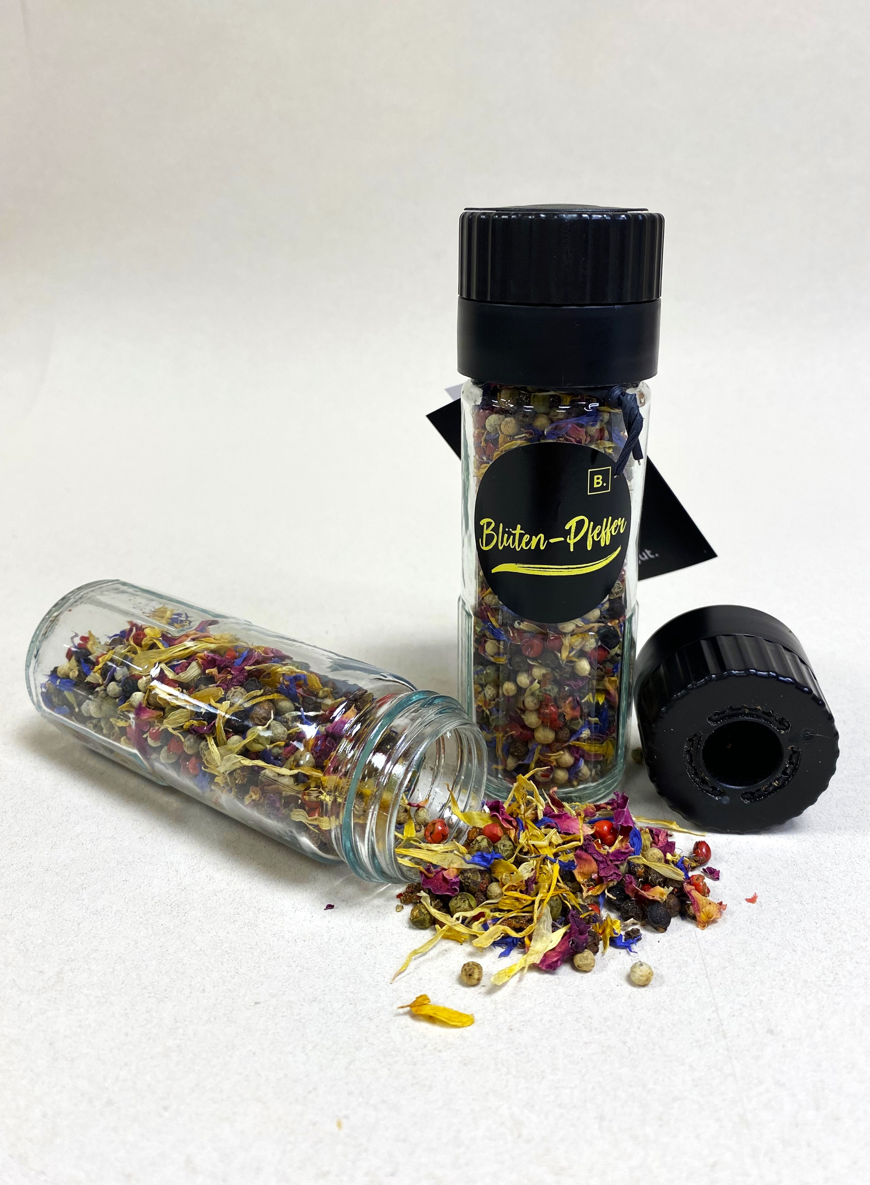 Nicht einfach nur Pfeffer – hübsch, elegant und praktisch in der Mühle. Bunte, ganze Pfefferkörner mit lieblichen Rosen-, Sonnenblumen-, Ringelblumen- und Kornblumenblüten. Heiterkeit zum Würzen! 40 g / Mühle